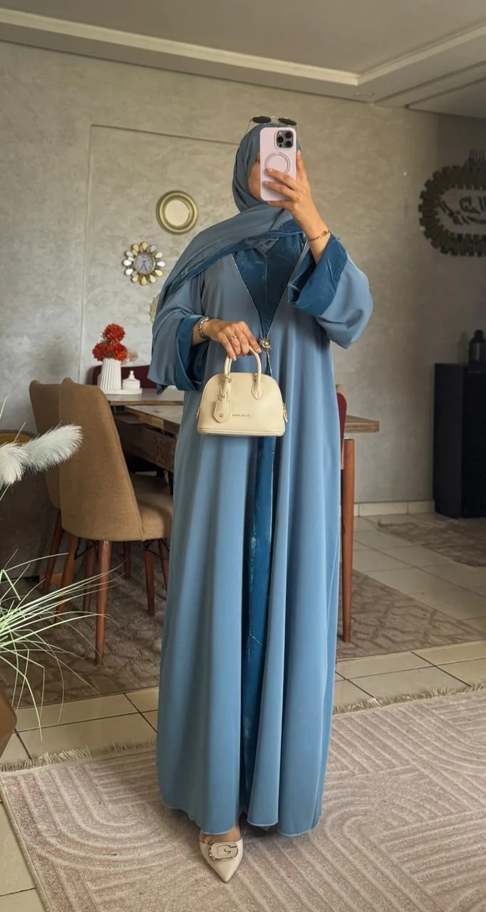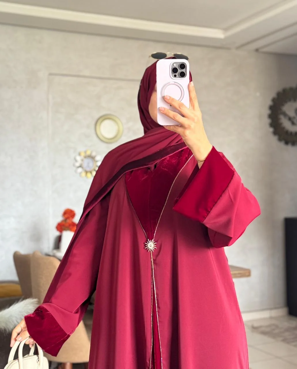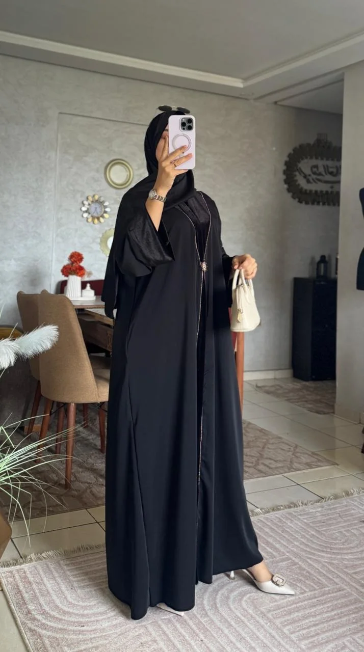 عارفينك كتقلبي على الهمة بلا كثرة الزواق، داكشي علاش جبنا ليك هاد التحفة. عباية كتجمع بين الكريب الملكي و لمسة الفيلور (Velours) اللي كيعطي هيبة فورية.